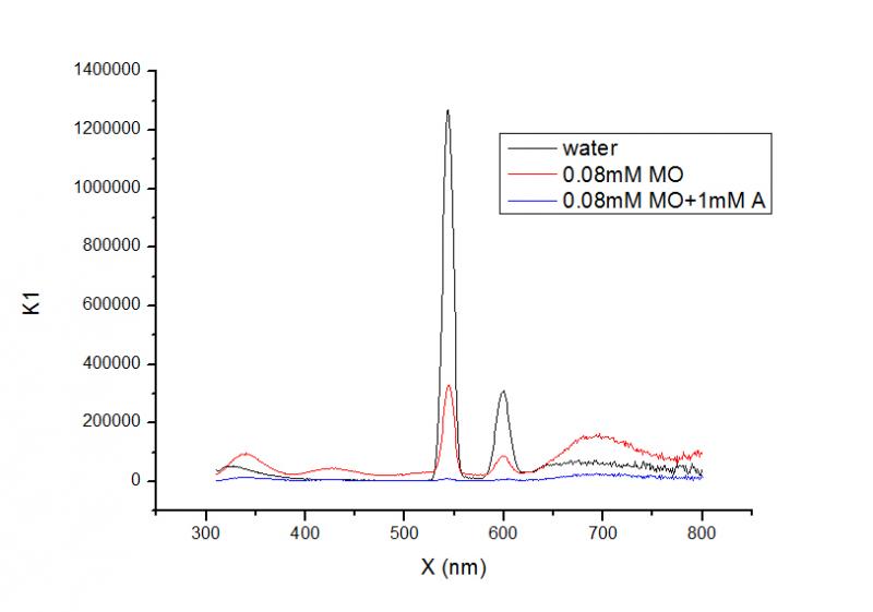 做了甲基橙的荧光(激发270nm),在约426处有荧光发射峰,如图中红线所示;黑线为水,在426并没有发射。加入物质A后,426处的荧光基本消失,但是在600nm处的水的二级拉曼散射也基本消失。请问这属于什么情况?属于正常的荧光猝灭吗?有虫友遇到这样的问题吗?非常感谢! |