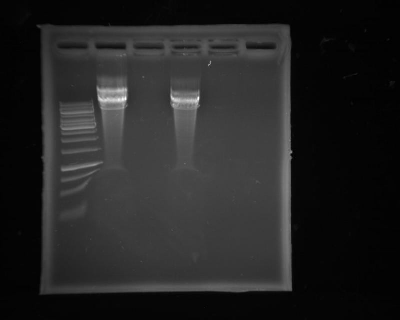 本人用的是0.5倍的TBE配制的1%的琼脂糖凝胶,也是用的0.5倍的TBE作为缓冲液跑的电泳。片段是大概8000左右的质粒。本来打算酶切的,只切开一点点,所以就成那个样子了。但是实在不明白为什么那MARKER会如此扭曲?胶凝了挺长时间的。电压:70V,跑了45min。还有最近酶切很是头痛啊,用快速酶双酶切切了40分钟,竟然只切开了一点点。实在很头疼啊,请各位高人指点啊。 电泳图片 |