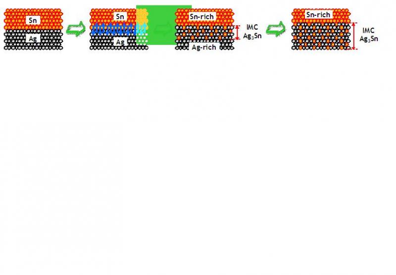 因为我不是学金属材料的,请教TX一个问题,看下面的解释对不对: Sn和Ag发生共晶反应(共晶反应的2相是Sn和Ag3Sn),在Sn和Ag之间形成了一个过渡层(见下图),这个过渡层的成分可以标注成Ag3Sn吗? |