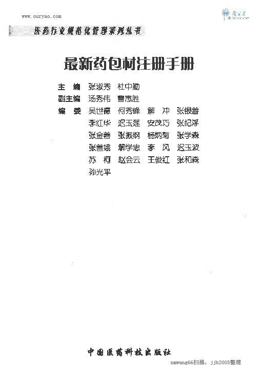 最新药包材注册手册--张淑秀 杜中勤 主编 下载:http://ishare.iask.sina.com.cn/f/25583480.html 前 言 为加强直接接触药品的包装材料和容器(简称药包材)的监督管理,2001年12月1日起实施的修订的《中华人民共和国药品管理法》巳将药包材纳入药品监督管理的范畴,明确规定了对药包材的监督管理内容。国家食品药品监督管理局自2002年起启动了药包材国家标准的制定和修订工作,陆续颁布了药包材国家标准。 2004年7月20日,国家食品药品监督管理局颁布了《直接接触药品的包装材料和容器管理办法》(局令第13号),对于直接接触药品的包装材料和容器进行统一监管,取消了原国家药品监督管理局令第21号对于药包材实行分 类管理的规定,国家制定药包材注册目录,并对目录中的产品实施生产和进口注册管理。 为了从事药包材生产、检验、注册、监督等工作的人员更好地了解和掌握国家对药包材的生产、注册的监督管理法规,药包材的现状和发展趋势5药包材国家标准,本书对于药包材管理法规作了全面概述,并收集了已经颁布的药包材国家标准,希望对从事相关工作有所帮助。 |