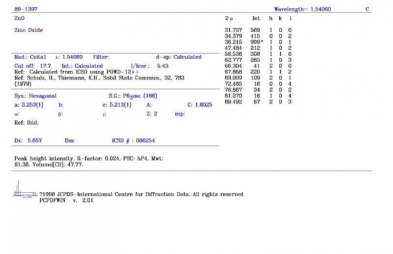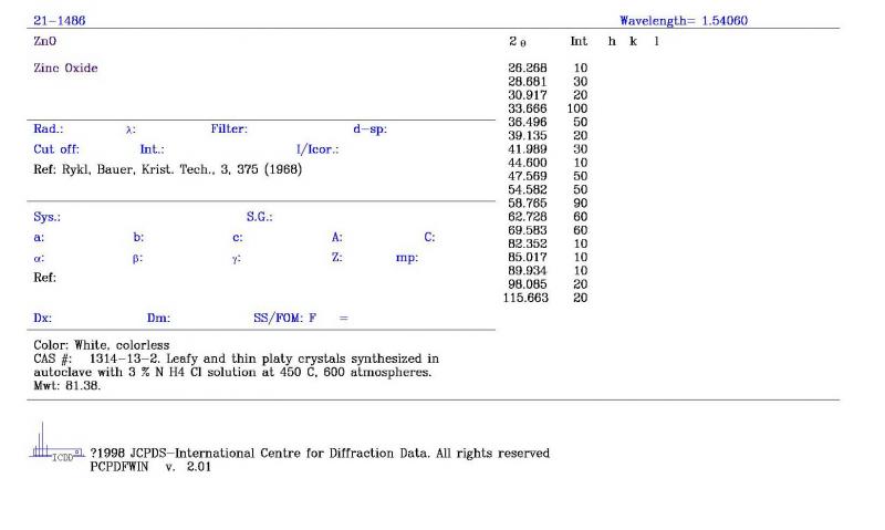 由于出差在外地带的电脑是win7系统的,没有装JADE,且听说不好装,只好在这求助了。那位好心人,能不能帮忙找一下ZnO、AlN的PDF卡片?可以不要图谱,只要晶面以及对应的2theta,谢谢啦!在线等....ing!