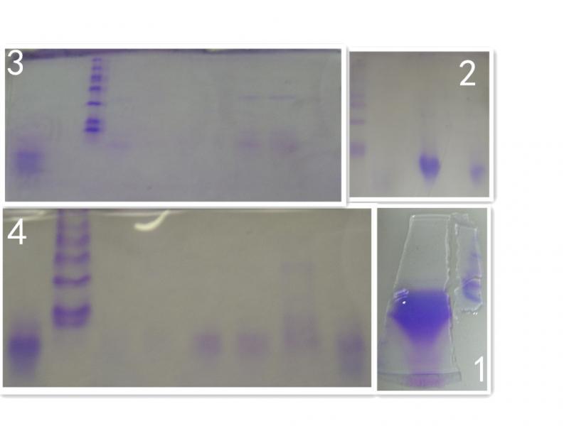样品是未知蛋白(显然marker不合适),四张图中大片蓝色部位都是点的同一个样,可以说明那就是目的条带吗?还有,这些图都不理想,分别有什么问题? 这是四次电泳的图片,所有的样品都是从微生物发酵液中硫酸铵沉淀法提取的目的蛋白 |