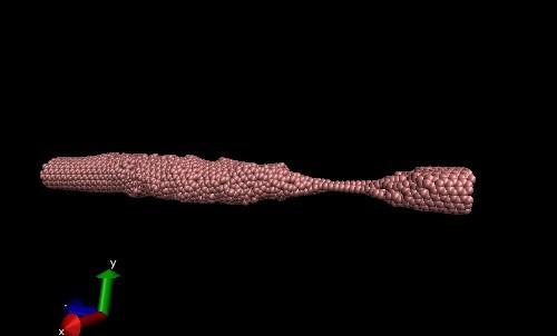 有几个问题: 1. 如果曲线图是应力和应变的关系,那么是否考虑用原子应力除以整个计算区域的体积vol是否正确。 维里应力要求体积是原子的domain,而vol是长方形计算区域的体积,显然不对。 如果考虑工程应力,那么应该是碳纳米管截面面积乘以当时拉伸的长度。 如果考虑真实应力,那么应该计算每个原子的维里应力,而两侧原子应力才是所求。 2. 碳纳米管在常温和低温时,文献报道拉伸是脆性断裂,但你的模拟在5K的温度下却表现为整体多处出现拓扑缺陷,大范围颈缩和长原子链,直径缩减等延展性的现象。我觉得这是不合理的。要好好检查势能和温度使用。 3. fix deform你用的是erate,模拟中间是否用了重启动restart,如果用了,会有问题。 |