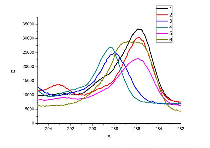 图中共有6条xps曲线,都是C1s谱,如果要校正的话,是不是每一条校正值都应该相同?因为发现有几条曲线BE都到288了,如果按首个最强峰减去标准值的方法去校正的话,就要减3.4ev,那为什么其他几条曲线的校正值相差会比较小,只有1.3ev甚至0.7ev。求虫友帮忙分析一下,这些图校正时是该减去同一个值还是每个都按上述方法去校正? C1s谱 |