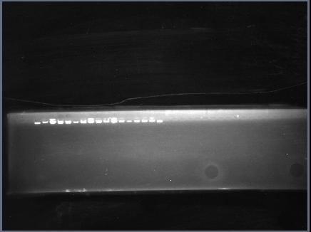 第一次提取DNA,图片两边的是mark,只有15个样,大家帮我看看为什么我的mark没跑开啊,还有点样孔为什么这么模糊,DNA条带离点样孔是不是太近了,我提取DNA的质量怎样,可以进行pcr实验吗?我跑胶只跑了40分钟,还想问大家我这个胶有没有做好呢?我做的胶是1%浓度的。 DNA电泳图 |