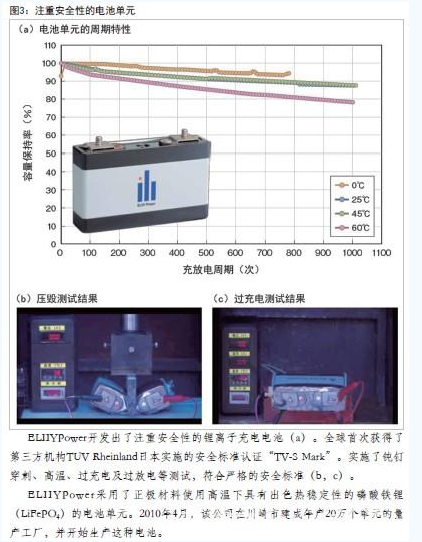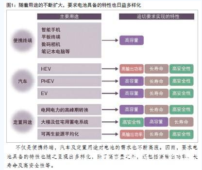 电池开发新动向--高容量、高安全性 多元化的性能需求 为了满足快速扩大的市场需求,充电电池的研发日益活跃。此前作为市场主流的便携终端用充电电池,以旨在实现高容量化的研发为主。手机及笔记本电脑等要求电池具备的最重要性能是,充电一次可使用很长时间。此前,人们一直认为寿命达到“2年左右即可”,宁可牺牲寿命也要优先实现高容量化。 但电动汽车及定置用途要求电池具备的性能更加多样( 图1 ) 。比如, 电动汽车有混合动力车( H E V ) 、插电式混合动力车(PHEV)及纯电动车(EV)等多种车型。各种车型要求电池具备的性能也不同。 具体而言,HEV在加减速时需要大电力交换,因此高输出功率的电池较为理想。而EV与便携终端一样,要求充电一次可行驶很长的距离,因此必须实现高容量化。对电池容量的要求为HEVPHEV>EV。不过,电动汽车与便携终端相比,要求电池具有更长的寿命及更高的安全性。 定置用途也一样。以夜间储存电力供白天使用的电网电力高峰期转换(Peak Shift)用途为代表,大楼蓄电系统及家用蓄电系统要求电池具备非常大的容量。而用来抑制安装量不断增加的大规模光伏发电及风力发电的输出功率变化时,则必须使用对输出功率变化具有较高耐性的高功率电池。而且,定置用途与电动汽车用途相比,不仅要求电池寿命更长,而且用于大楼蓄电系统及家用蓄电系统时,必须具备发生火灾时不会燃烧的高安全性。 高容量化 各领域将如何瞄准2 0 2 0年推进电池开发呢?在便携终端领域,估计今后的开发主流仍以实现高容量化为目标(图2)。尽管目前的便携终端用充电电池也有镍氢充电电池及镍镉(Ni-Cd)充电电池等,但传统手机、智能手机、笔记本电脑及平板终端已开始采用锂离子充电电池。 目前,锂离子充电电池单位体积的能量密度已达到600Wh/L左右,在市面上的充电电池中能量密度最高。 但负极材料采用石墨的现行锂离子充电电池的能量密度正在接近极限。今后将通过混合使用硅(Si)及锡(Sn)等合金类负极材料,来提高能量密度,目标是到2020年使能量密度达到800~1000Wh/L左右。 便携终端用电池方面,虽然高容量化仍是今后的开发主流,但部分企业已开始转向其他开发方向,比如将原来长达1~2小时的充电时间缩短至10分钟左右,在不增加容量的情况下提高易用性。 以NTT DoCoMo为例,该公司在CEATEC JAPAN 2011上公开了可在10分钟内快速充电的移动电源试制品。可利用外出前或在餐厅吃饭时等较短的时间,为移动电源快速充电,然后再利用移动电源为智能手机充电。 如果能够结合使用N T TDoCoMo已开始销售的无线供电系统,构建可随时随地快速充电的基础设施,便有望在不增加充电电池容量的情况下提高便携终端的易用性。 高安全性 随着电池用途的不断扩大,电池的开发重心呈现出了高容量、高安全性及长寿命等多样化趋势。即便如此,在市场快速扩大的电动汽车用途与定置用途方面,今后开发的大前提仍是安全性高和长寿命。 在这种形势下,从事定置用锂离子充电电池业务的ELIIYPower宣布,2011年8月其大型锂离子充电电池全球首次获得了国际第三方机构TUV Rheinland日本实施的安全标准认证“TV-S Mark”(图3)。 达到了振动测试、贯通测试、冲击测试、冷热冲击测试、短路测试、过放电测试、落下测试、浸水测试、破坏测试、异常加热测试及过充电测试等11个项目的测试及工厂监查的要求,并获得了认证。 2010年12月,ELIIYPower通过在μm级别上对正极和负极进行微细构造控制,优化与电解液等的组合方式,使单元的能量密度比其原产品提高了约10%。而且,将使用温度范围扩大到了-20~60℃,尤其提高了高温下的循环特性以及低温下的充电性能。 据ELIIYPower介绍,尽管以前就对这种电池单元实施过钝钉穿剌、压碎、过充电及过放电测试等,并证明不会冒烟、起火及破裂,但考虑到今后要向家庭等普及这种电池,便取得了第三方机构的认证。 受东日本大地震后日本各地电力短缺的影响,住宅企业等开始考虑采用家用蓄电系统。但目前的现状是,很多住宅企业都很担心锂离子充电电池的安全性,希望电池厂商能够大幅提高电池单元的安全性。 实际生活中也曾发生过让这种担忧加剧的事故。2011年9月下旬,此前作为大型蓄电池不断获得应用的硫化钠(NaS)电池发生了火灾事故。 作为销售商的日本碍子(NGK)决定停止供货,并于2011年10月28日宣布停产NAS电池。 兼具高容量高安全 为了在提高安全性的同时实现高容量化,利用固体电解质而非目前主流的电解液的研发活动日益活跃。这种电池称为全固体电池。 全固体电池方面,人们发现了离子导电度与传统电解液同等的物质。 这就是硫化物类固体电解质之一——Li10GeP2S12。表示锂扩散速度的离子导电度可在室温(27℃)下达到1.2×10-2S/cm,这是一个极高的数值。 开发出这种电解质的是,东京工业大学、丰田与高能源加速器研究机构组成的研发小组。主导研发的东京工业大学研究生院综合理工学研究系物质电子化学专业教授菅野了次自信地表示,“打破了此前固体电解质无法实现的、在室温下达到10-2S/cm的极限”。 丰田已试制出了采用这种固体电解质的电池单元(图4)。解决了此前全固体电池存在的大电流放电问题。测试结果显示,可实现50C的高倍率放电。 测试时, 采用了由碳材料混合而成的电池单元, 正极使用钴酸锂( L i C o O 2) , 负