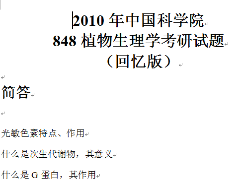 【真题资源】2010年中国科学院848植物生理学考研试题(回忆版)