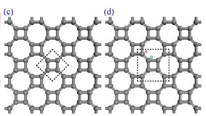 Planar T graphene after geometry optimization can be described by the plane group p4mm with a lattice constant 3.42A ° containing four atoms in each cell, close to the value (3.47 A ° ) of the model 7 in [3]. Buckled T graphene of the plane group p4mm has a lattice constant 4.84A ° and an equilibrium height difference (z) of about 0.55 A ° between two nearest-neighbor tetrarings. 按照其论文里面提的 c和d是不一样构型 c是平的,d是起伏的 |