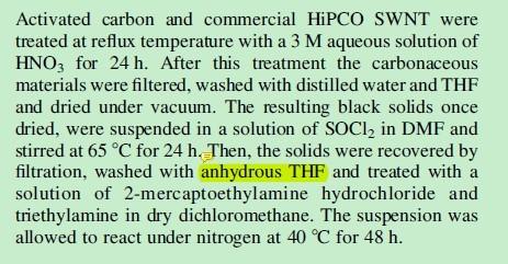 The resulting black solids once dried, were suspended in a solution of SOCl2 in DMF and stirred at 65℃ for 24 h 得到的黑色干燥固体到底是分散到SOCl2 还是分散到DMF中呢?谢谢了 [ Last edited by hel0123 on 2012-8-9 at 21:57 ] |