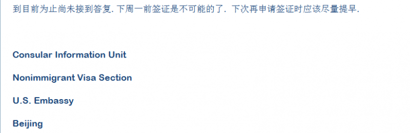 昨晚打电话得知状态为“it is no pending”,觉得签证应该有希望拿到。可是北京使馆的回复实在又把我从希望中推向了绝望。北京大使馆回复如下: 去不了去不了啦。现在只能后悔没有办理因私,因公的从我交材料到得知面签时间有一个月啊,如果当初邀请函不出问题也不会这样啊。提前一个星期也好啊。 嗯,祝各位被check的早日clear。别像我一样悲剧了。 |