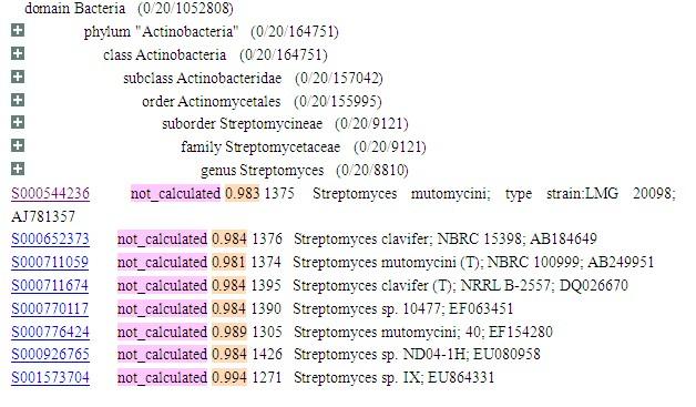 再往下是链霉菌属内的种,从左到右依次有序列号,培养信息,相似度,16s片段长度,种属名,菌株号。