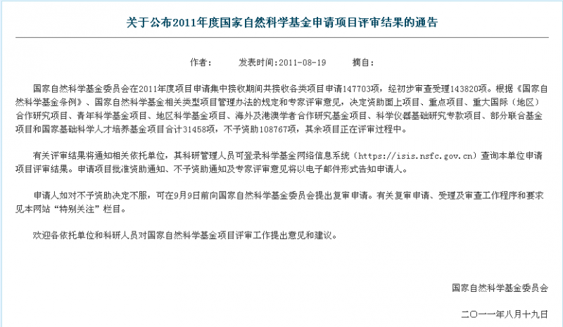 注意:去年(2011年)国家自然科学基金申请项目评审结果的通告是8月19日公布的已有7人参与