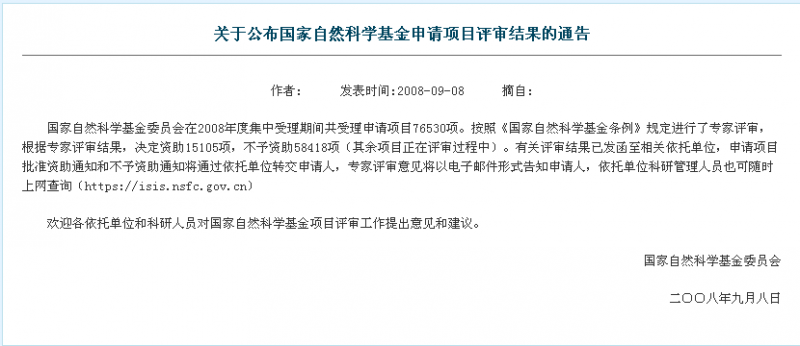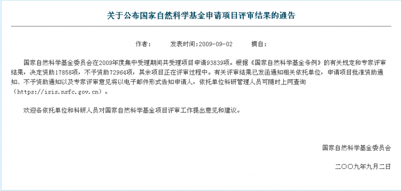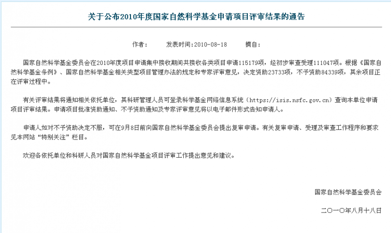 转(基金委)帖:关于公布2010年度国家自然科学基金申请项目评审结果的通告