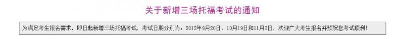 为满足考生报名需求,即日起新增三场托福考试,考试日期分别为:2012年9月20日、10月19日和11月2日,欢迎广大考生报名并预祝您考试顺利!