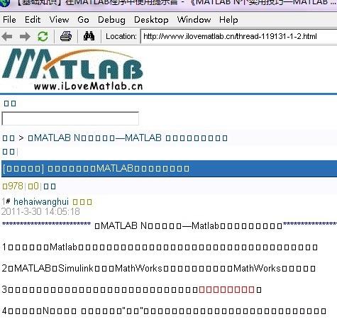 各位高手,我在运行一个matlab模拟声音的程序是,出现了如下红色的的提示。请问是什么原因,请指教,谢谢啦 ??? CreateProcess failed. Error in ==> web at 287 stat = ibrowse(html_file); Error in ==> example1 at 17 web -browser http://www.ilovematlab.cn/thread-119131-1-2.html 后来,我经过baidu后知道将原程序中的-browser改为-new,再次运行为出现上述红的提示,但弹出以个乱码的窗口,附图如下。 原程序也附上,望各位高手给予解答,谢谢。 switch_expr=input('输入一个数:'); switch switch_expr case 1 %鸟声 load chirp sound(y,Fs) case {2, 3, 4} %锣声 load gong sound(y,Fs) otherwise %火车声 load train sound(y,Fs) end web -new http://www.ilovematlab.cn/thread-119131-1-2.html |