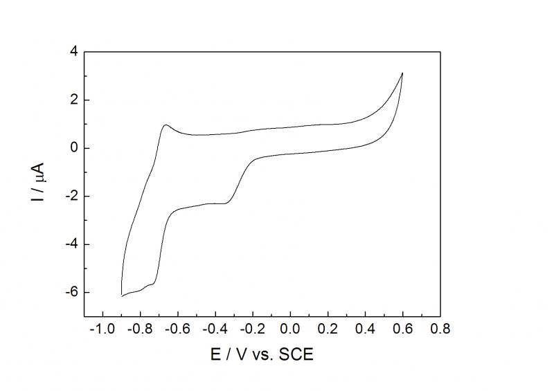 本人测得钴卟啉在pH=12缓冲液中的循环伏安曲线,如下图。按照文献,-0.70 V处的一对氧化还原峰对应的是Co(II/I)TMPyP电对,-0.34 V处为Co(III)TMPyP不可逆的还原峰。 审稿人提出的问题是:什么原因造成不可逆的还原峰?是因为钴卟啉的分解造成的吗? 请高手赐教! |