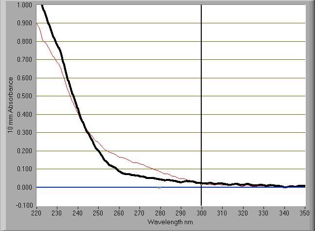 提取的DNA纯度很低,260/280的值大概在0.9-1.0之间,吸收峰在270nm处(见上图),怕直接作为荧光定量RCR的模板影响实验结果,所以又加了一步氯仿抽提,乙醇沉淀,接着又测定DNA的含量和纯度,结果太诡异了,竟然没有吸收峰了,但是纯度提高了,DNA含量降低了,(见下图) 上图 下图 |