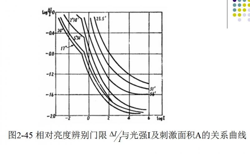 这个图的标题是“相对亮度辨别门限与光强I及刺激面积A的关系曲线”,请问哪个值是表示刺激面积A呢? 图中的 24°,17°等 又表示什么呢? 谢谢大家