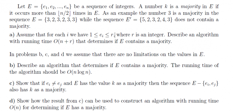 算法题?英文倒是简单哦 E是一个整数的序列,含有n个整数,可以有相同的整数,如果某个整数出现的次数,大于一半,比如n=10,其中整数k出现了6次(>10/2),就可以说的大多数(majority)。 问题a限定了每个整数数值的范围,必须在[1,r]之间,要设计一个时间O(n+r)内的算法判定某个序列E有没有majority。 问题b,c,d没有数值范围限定。 问题b要求在时间O(nlogn)内判定E有没有majority。 问题c,假设序列E有majority,是k,给定序列中两个不等的数,证明,去掉这两个数之后的序列仍有majority是k。 问题d,利用c的结果,将b算法改进,让时间从O(nlogn)到O(n)。。。 自己做题去吧。。。哎 |