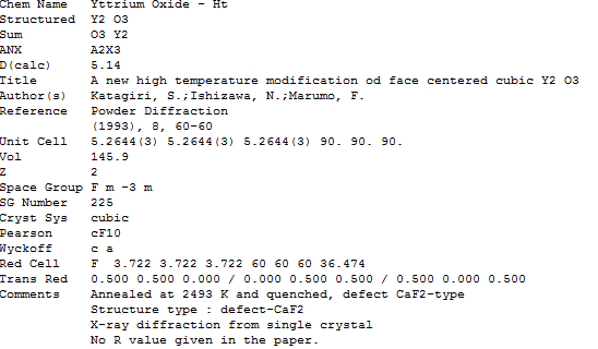 这是在ISCD中找到的一种Y2O3的立方相: 这是在ISCD中找到的Y2O3的一种结构,但是由其导出的晶胞图如下: 其在ISCD中参数如下: 这明显与Y2O3的化学式不符,而应该是YO2,所以有所疑问? 另外有哪位大侠可以推荐一个权威的晶体结构查询的网站吗? ISCD中Y2O3.png 结构图.png 参数.png |