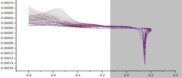 我这个循环伏安法的图觉得有点怪怪的 是有关纳米银材料对双氧水的检测 想问问这个为什么在0.15左右有这么尖的一个尖峰啊 还有从这图上看 这个材料对双氧水有没有响应啊 非常期待大家的回答啊