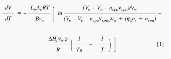 细胞冷冻过程中,会脱水收缩,Mazur提出了一个模拟此传输过程的数学模型,只涉及水的传输过程,而在冷冻过程中通常会加入冷冻保护剂cpa,后来的学者对Mazur的模型进行了修正,将cpa包含了进去,如图片中公式所示。