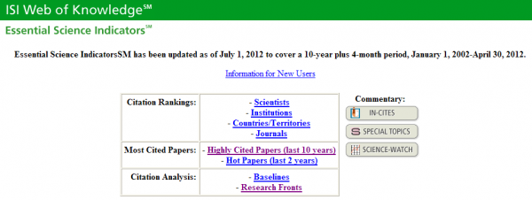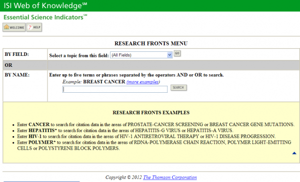 在web of Knowledge平台上选择“其他资源”,在相应页面上选择“Essential Science Indicators”,即进入数据库。 左侧分析工具,下面第二个就是Essential Science Indicators数据库 选择Research Fronts就是研究前沿。 将你的文章题目输入进去,如果能检索到,说明你的研究课题就是研究前沿。 关于什么文章才能进入Essential Science Indicators这个库。可以参考: http://www.lib.sjtu.edu.cn/view.do?id=1464 |