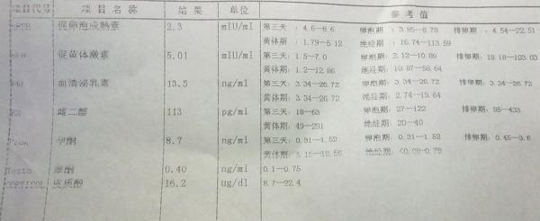 我看网上说做内分泌七项要在月经第三天做,可是我还没到医生让我做了,有什么影响吗?貌似内分泌七项拍的不太清楚,我手打一份吧。 促卵泡成熟素2.3mIU/ml(第三天4.6—8.6 卵泡期3.85—8.78 排卵期4.54—22.51 黄体期1.79——5.12 绝经期16.74—113.59) 促黄体激素5.01mIU/ml(第三天1.5—7.0 卵泡期2.12—10.89 排卵期19.18—103.03 黄体期1.2—12.86 绝经期10.87—58.64) 血清泌乳素13.5ng/ml(第三天3.34—26.72 卵泡期3.34—26.72 排卵期3.34—26.72 黄体期3.34—26.72绝经期2.74—19.64) 雌二醇113pg/ml(第三天18 —63 卵泡期27—122 排卵期95—433 黄体期49—291 绝经期20—40) 孕酮8.7ng/ml(第三天0.31—1.52 卵泡期0.31—1.52 排卵期0.45—3.6 黄体期5.16—18.56 绝经期《0.08—0.78) 睾酮0.40ng/ml (0.1—0.75) 皮质醇16.2ug/dl(8.7—22.4) |