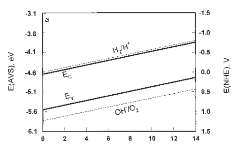 你这种善于思考分析问题的方式值得嘉奖。 你的质疑是正确的,半导体导带能级不会随pH升高而变化,变化的H+的还原电位随pH增加而变得更负。要想半导体导带上的电子转移到H+能级上,H+的能级必须低于导带能级,根据你给的E-pH图可以看出,原来在酸性和中性条件下H+能还原的反应,不一定就能在碱性区域发生。因为,半导体导带能级位置还是原来的位置,可碱性下H+的电位能级位置却向上移动,有可能接近甚至向上超过导带能级,这时发生从导带向H+能级转移电子几率降低,甚至不转移了。因此,CdS文献中观察的结果是对的,可那个作者误认为pH改变了半导体的导带位置。 |