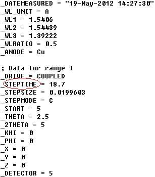 step time指单步累计测量时间,单位为秒。根据uxd的参数是可以计算扫描速度的。 从附图给出的信息看,可能仪器配置的探测器是阵列探测器,采用连续扫描方式以步长为0.0199603度(设置步长应为0.02度)从2theta=5度起测,单步累计测量时间为18.7秒,但因阵列探测器是由一组线性排列探测元构成的,实际上每个探测元的单步测量时间应以此数除以探测元总数(设为N),因此以度/min为单位表示的扫描速度计算式为:SCANSPEED=60*STEPSIZE*N/STEPTIME |