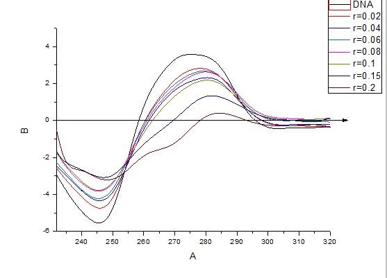 该药物与DNA作用时,对DNA的构象的影响很明显,也有规律。正峰的降低和红移说明对DNA的碱基对有显著作用,负峰的变化也显示其对DNA螺旋结构的影响,当药物浓度增大时出现稍微不规律现象,我想可能有这方面原因: 1. 溶解药物的溶剂与溶液DNA的溶剂不同,药物溶剂在混合液中的增加对DNA产生作用,造成沉降。 2. 若药物溶剂与DNA溶剂相同,就是药物的作用造成的。我想应该是第一种原因。 |
