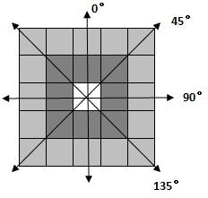 | A description of the pixel distance and directions. The high grey grid indicates one pixel of an image object, eight middle (low) grey grids indicate pixels that are one (two) pixel(s) distant from the high grey grid in four directions. |