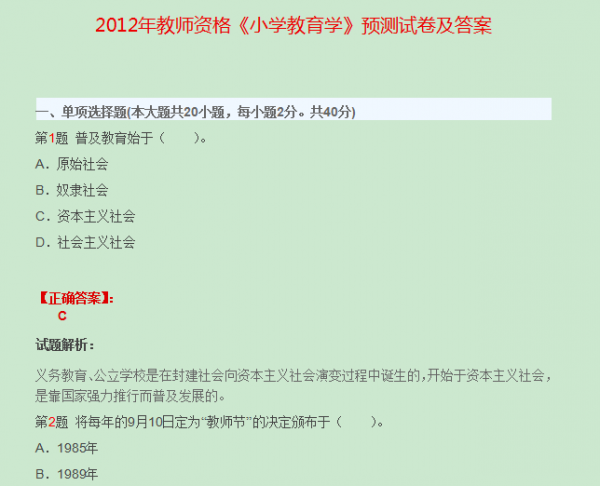 【模拟试题】2012年教师资格《小学教育学》预测试卷及答案
