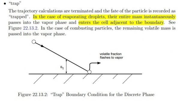 DPM模型中wall边界条件类型有捕捉、反射、逃逸等等 以trap为例,满足什么样的条件壁面才会将离散相粒子捕捉呢? 附图为help中trap的相关内容,我的理解是:离散相粒子以一定角度向壁处运动,被wall捕捉。具体这个角度是多少,不得而知; 我就想知道,软件执行粒子被捕捉的原理,即其控制方程是什么 help里没有见到相关控制方程,不知道是我没找到还是缺少没有(我有认真找过) 希望大家各抒己见。如果help中有相关控制方程,烦请大神告知一下,谢谢! |