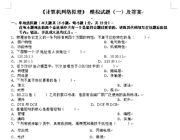 【习题资源】自学考试《计算机网络原理》 模拟试题及答案