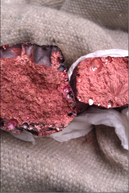 紫杂铜里面应该还会混一点黄铜之类的东西 所以氧化 扒渣除渣 再还原是必要的 简单讲下样子在这个过程的变化 充分熔化了后扒渣完的样子就如左边的断面(可能有些致密,因为氧化是还原逆过程)→ 再氧化就会会出现片状(如右)→再氧化片状消失(断面晶粒比较粗)→开始还原→还原一段时间后样子会有条状晶柱但是断面主体晶粒还是较粗→再还原粗状晶粒开始变细条状晶柱依然存在→再还原断面晶粒开始致密条状晶柱依然存在(我们称为“来样子”)→继续还原条状晶柱消失断面全部呈细密晶粒 且有微量闪点(还原完毕,具体看取样表面槽) 所以我认为一方面是溶解氧在冷却过程的辨析还有再结晶过程,可以认为是铜和氧化亚铜的共晶 析出的铜向内扩散和铜反应成氧化亚铜 因为吉布斯函数在降温在一定范围内反应自发 且样子在冷却过程是由外向内析出氧,所以外部呈粗状,逐渐向内反应但是因为氧化不够导致了无法全面氧化至样芯(导致了右图那种片状)。再氧化因为溶解氧足够了才能向芯部充分反应,样子会犹如左图。 由此可以判断有片状或者柱状晶型的样子氧化不足(致密晶状可以认为是片状或者柱状晶型的一种高级态)。不建议用插树还原,环保、劳动量、还原效果、铜直收率都是很大的问题。可以用天然气或者煤粉进行还原,速度快效果很好。 以上是个人见解,如有错误欢迎指正 |