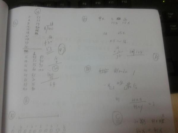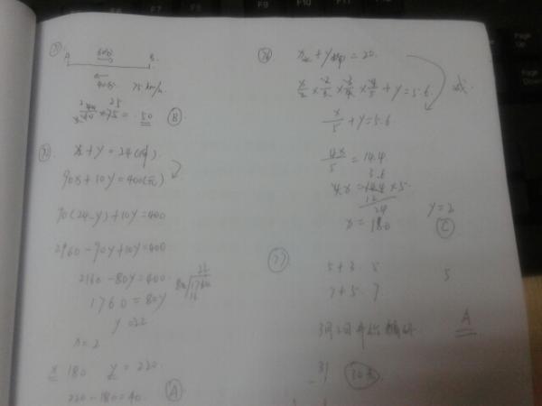 写在前面的话 有可能出答案会有点迟,但是大家放心,我会尽量的早点出答案的,谢谢大家积极参与做题哦,尽量用多种方法做题,自己总结下,看哪种简单 71.一辆汽车从A地开到B地需要一个小时,返回时速度为每小时75公里,比去时节约了20分钟,问AB两地相距多少公里?() A. 30 B.50 C.60 D.75 72.某服装店进了衬衫和背心总共24件,总进价为400元。已知衬衫和背心每件的进价分别为90元和10元,问衬衫总进价比背心总进价()。 A. 低40元 B.高40元 C.低120元 D.高120元 73.甲乙丙三人在2008年的年龄(周岁)之和为60,2010年甲是丙年龄的两倍,2011年乙是丙年龄的两倍,问甲是哪一年出生的?() A. 1988 B.1986 C.1984 D.1982 74.将一个白色正立方体的任意2个面分别涂成绿色和红色,问能得到多少种不同的彩色正立方体?() A. 2 B.4 C.6 D.8 75.商场销售某种商品的加价幅度为其进货价的40%,现商场决定将加价幅度降低一半来促销,商品售价比以前降低了54元。问该商品原来的售价是多少元?() A. 324 B.270 C.135 D.378 76.一桶水含桶共重20千克,第一次倒掉水量的1/2,第二次倒掉剩余水量的1/3,第三次倒掉剩余水量的1/4,第四次倒掉剩余水量的1/5,最终水和桶共重5.6千克,问桶的重量为多少千克?() A. 1.2 B.1.6 C.2 D.2.4 77.小张每连续工作5天后休息3天,小周每连续工作7天后休息5天。假如3月1日两人都休息,3月2日两人都上班,问三月份有多少天两人都得上班?() A.12 B.14 C.16 D.18 78.一本书有100多页,小赵每天看6页,第31天看完,小张每天看7页,第26天看完。小周每天看2页,问第几天可以看完?() A.90 B.91 C.92 D.89 79.某条公交线路上共有10个车站,一辆公交车在始发站上了12个人,在随后每一站上车的人数都比上一站少1人。到达终点站时,所有乘客均下了车。如果每个车站下车乘客数相同,那么有多少人在终点站下车?() A.7 B.9 C.10 D.8 80.运动会上100名运动员排成一列,从左向右依次编号为1-100,选出编号为3的倍数的运动员参加开幕式队列,而编号为5的倍数的运动员参加闭幕式队列。问既不参加开幕式又不参加闭幕式队列的运动员有多少人?() A.46 B.47 C.53 D.54 81.在一排10个花盆中种植3种不同的花,要求每3个相邻的花盆中花的种类各不相同,问有多少种不同的种植方法?() A.6 B.12 C.18 D.24 82.甲乙两人早上10点同时出发匀速向对方的工作单位行进,10点30分两人相遇并继续以原速度前行。10点54分甲到达乙的工作单位后,立刻原速返回自己单位。问甲返回自己单位时,乙已经到了甲的工作单位多长时间?() A.42分 B.40分30秒 C.43分30秒 D.45分 83.三个快递员进行一堆快件的分拣工作,乙和丙的效率都是甲的1.5倍。如果乙和丙一起分拣所有的快件,将能比甲和丙一起分拣提前36分钟完成。问如果甲乙丙三人一起工作,需要多长时间能够完成所有快件的分拣工作?() A.1小时45分 B.2小时 C.2小时15分 D.2小时30分 84.环保部门对一定时间内的河流水质进行采样,原计划每41分钟采样1次,但在实际采样过程中,第一次和最后一次采样的时间与原计划相同,每两次采样的间隔变成20分钟,采样次数比原计划增加了1倍。问实际采样次数是多少次?() A.22 B.32 C.42 D.52 85.某市有甲、乙、丙三个工程队,工作效率比为3∶4∶5。甲队单独完成A工程需要25天,丙队单独完成B工程需要9天。现由甲队负责B工程,乙队负责A工程,而丙队先帮甲队工作若干天后转去帮助乙队工作。如希望两个工程同时开工同时竣工,则丙队要帮乙队工作多少天?() A.6 B.7 C.8 D.9 ![]() [ Last edited by teresa9588 on 2012-9-19 at 10:09 ] [ 来自版块群 山西公务员考试 ] |