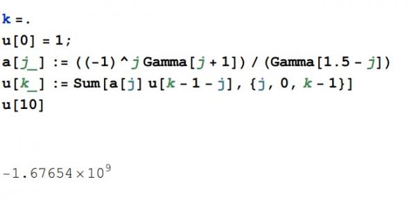 u=zeros(100,1); a=zeros(100,1); u(1)=1; for i=1:100 a(i)=(-1)^(i-1)*gamma(i)/gamma(2.5-i); end for j=2:100 for i=1:j-1 u(j)=u(i)+a(i)*u(j-i); end end 在matlab里面数列的下表不能从0开始,所以要用u(1),a(1)分别表示u0和a0。公式中的j+1在这里用i表示。每一个uk+1等于k+1个数的和,比如说程序中u(5)实际表示u4对应于i从1到4四个数的和 [ Last edited by dbb627 on 2012-9-23 at 20:18 ] |