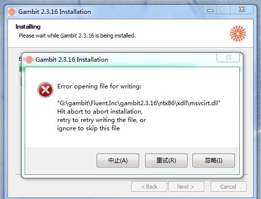 装fluent6.3时,都是按安装步骤来的,之前gambit安装成功一次,但让我卸载了,之后再也装不上了,安装gambit时总是出现这样的框框。怎么回事a?