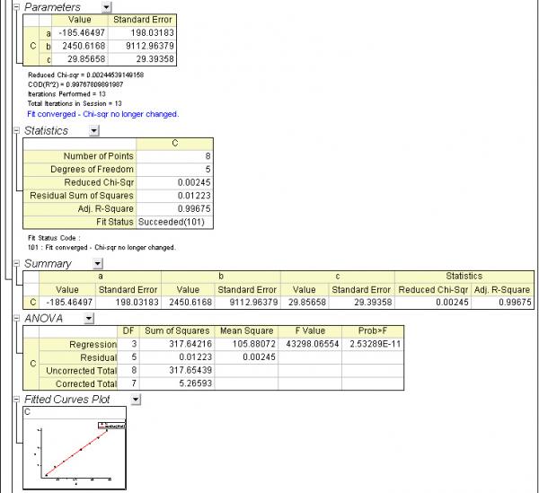 用1stopt拟合还不错 模型公式: lnx = a+b/t+c*ln(t) lnx = -185.464962320746+2450.61659666032/t+29.8565817212573*ln(t) 迭代数: 21 计算用时(时:分:秒:微秒): 00:00:01:62 优化算法: 通用全局优化法(UGO1) 计算结束原因: 达到收敛判断标准 均方差(RMSE): 0.0390943689326188 残差平方和(SSE): 0.0122269574579177 相关系数(R): 0.998838374773352 相关系数之平方(R^2): 0.997678098919872 决定系数(DC): 0.997678098919872 卡方系数(Chi-Square): -0.000936455199353572 F统计(F-Statistic): 1076.70392222814 参数 最佳估算 ---------- ------------- a -185.464962320746 b 2450.61659666032 c 29.8565817212573 ====== 结果输出 ===== No 实测值lnx 计算值lnx 1 -7.5542743 -7.49954408948872 2 -7.0628479 -7.13479202728982 3 -6.751681 -6.77381339942846 4 -6.4273676 -6.41655853988692 5 -6.0779958 -6.06297667450167 6 -5.7304925 -5.71301620987572 7 -5.402791 -5.36662498297483 8 -4.9836263 -5.02375047655377 2. 模型公式: lnx = a+b/t+c*ln(t) lnx = 7.55133137963977+(-3135.00398410314)/t+(-0.428468530566098)*ln(t) 迭代数: 30 计算用时(时:分:秒:微秒): 00:00:01:531 优化算法: 通用全局优化法(UGO1) 计算结束原因: 达到收敛判断标准 均方差(RMSE): 0.0181130816686446 残差平方和(SSE): 0.00262466982027991 相关系数(R): 0.998718568527438 相关系数之平方(R^2): 0.997438779121495 决定系数(DC): 0.997438779121495 卡方系数(Chi-Square): -0.000258954823191428 F统计(F-Statistic): 976.09699381312 参数 最佳估算 ---------- ------------- a 7.55133137963977 b -3135.00398410314 c -0.428468530566098 ====== 结果输出 ===== No 实测值lnx 计算值lnx 1 -5.5828761 -5.57686058344806 2 -5.389373 -5.40476439830922 3 -5.266304 -5.23846366360058 4 -5.0467256 -5.07767434750583 5 -4.9175211 -4.9221306199374 6 -4.7934429 -4.77158341936103 7 -4.6307729 -4.6257991528502 8 -4.4748191 -4.48455851514662 |