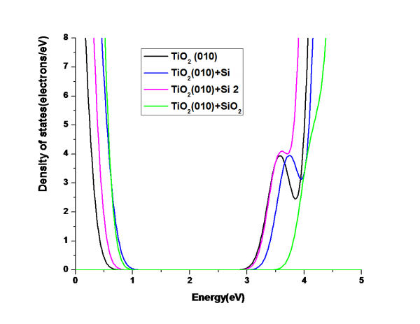 四条线依次表示纯净表面、一个Si、两个Si替代Ti和表面接SIO2簇的DOS图, 就是想让价带顶的峰能够显示出来 可是我调整smearing的值之后,是有峰了 但是纯净表面的也会有,所以还请高人指点一下 还可以怎么办