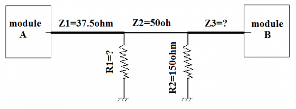 信号从模块A传输到模块B,途中电线可分为三段,第一段电阻37.5欧,第二段50欧,第三段未知。每段电线之间有接地线,第一接地线电阻未知,第二接地线电阻150欧。可参见下面的示意图,所有连接电容均不考虑,为使信号尽可能完整、无损传到模块B,Z3和R1如何取值? 谢谢大家啦。 希望给出完整解答,以及相关知识点和可在那本教科书上找到。 |