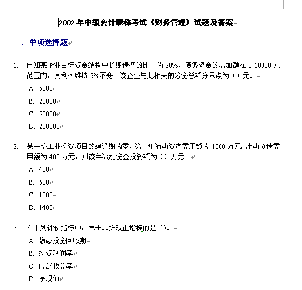 【真题资源】2002年中级会计职称考试《财务管理》试题及答案