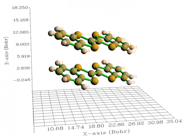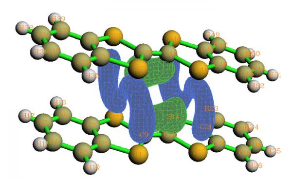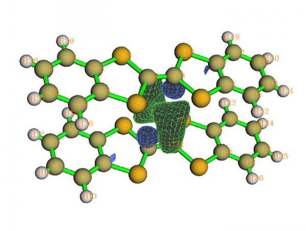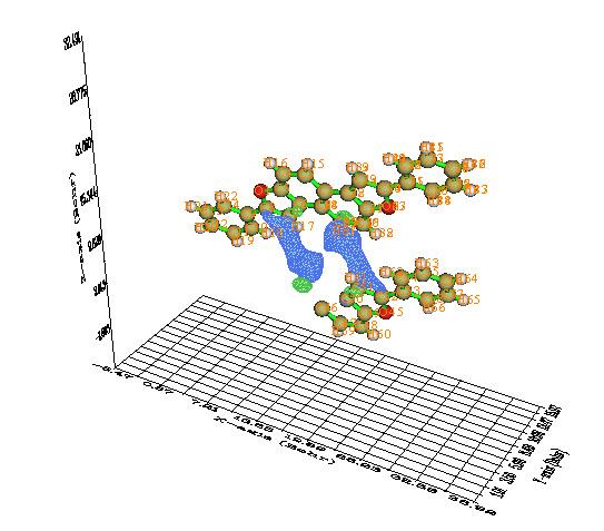 分子间轨道重叠的图形显示和计算 注:本文涉及到的非Multiwfn产生的文件都可以在这里下载:http://pan.baidu.com/share/link?shareid=64202&uk=1074012119。 分子间轨道重叠,就是指离得比较近的两个分子,其中一个分子的轨道会与另一个分子的轨道发生重叠。轨道既可以是分子轨道,也可以是定域化轨道等形式。本文讨论的是分子轨道重叠,这有很多用处,比如前线轨道理论涉及到两分子间HOMO-LUMO的重叠;在讨论分子间电荷转移问题时,涉及到两分子间HOMO-HOMO以及LUMO-LUMO轨道的重叠。本文第一节介绍一种笔者提出的图形化显示轨道间重叠的新方法,第二节介绍怎么在Multiwfn程序里精确计算轨道间重叠积分值。 本文的例子是从CCDC数据库里的二苯并-四硫富瓦烯(DB-TTF)的晶体结构中取出的一对儿(下文称二聚体),如下所示 计算都是在PW91PW91/6-31G*下由Gaussian09进行,结构直接利用晶体数据不做优化。 1 分子间轨道重叠的图形显示 DB-TTF的HOMO和LUMO轨道如下所示 对照MO图形和前面给出的二聚体图形,会感觉分析轨道的重叠很不方便,因为这个体系相对较大,MO图形复杂,而且二聚体中单体的相对位置是斜侧着,很难想象哪些区域是轨道以相位相同方式重叠,哪些区域是相位相反重叠,以及重叠程度有多大,重叠积分应该是正还是负。尽管我们可以将这两个LUMO都作出来,通过网格方式显示以便于展现交叠,如下所示,但是图像看起来很乱,难以直观地考察重叠方式 笔者提出一个十分简单的办法,可以让重叠区域、程度、相位匹配方式直接显示出来,也就是:令相应两个轨道波函数值相乘,然后显示等值面。 之所以这么做,原理很简单。两个轨道重叠区域大的地方,乘积必然大,因此等值面能将重叠大的区域勾勒出来。而相同isovalue设定下,等值面越大,则必然重叠程度越高。如果两个轨道在某处相位相同,那么乘积必然为正,相位不同则为负,所以根据等值面对应的符号值就知道两个轨道在相应位置是以相位相同还是相反方式重叠了。下面就介绍下怎么利用Multiwfn通过这种方式显示DB-TTF二聚体的LUMO轨道间的重叠。 从CCDC数据库里提取DB-TTF二聚体结构并经过适当处理后,得到了二聚体pdb文件DB-TTFdimer.pdb。首先,用Multiwfn对这个结构随便计算一种函数的格点数据。这一步的目的只是让Multiwfn自动给出能够包含整个二聚体结构的格点设定。启动Multiwfn,依次输入 c:\DB-TTFdimer.pdb //DB-TTFdimer.pdb的路径 5 //计算格点数据 100 //用户自定义函数。如果用户不改代码,这个用户自定义”函数值在各处为1,所以不耗任何计算量 2 //中等质量格点设定 2 //将格点数据输出到当前目录下的userfunc.cub 将DB-TTFdimer.pdb当中第一个单体的坐标提取出来并保存为Gaussian输入文件DB-TTF1.gjf。Route section写上pw91pw91/6-31G* nosymm 这里nosymm是为了确保Gaussian不会自动改变这个单体的坐标。用Gaussian计算DB-TTF1.gjf,并且将相应的chk文件转换为DB-TTF1.fch。 再将第DB-TTFdimer.pdb当中第二个单体的坐标提取出来并保存为Gaussian输入文件DB-TTF2.gjf。Route section也写上pw91pw91/6-31G* nosymm并通过Gaussian计算,转换得到DB-TTF2.fch。 Hint: 如果你想省时间,可以将上一步得到的DB-TTF1.chk复制为DB-TTF2.chk,并且在当前任务计算时写上guess=read。这样,在计算DB-TTF2时就会读取DB-TTF1的收敛的波函数作为初猜(Gaussian自动会对波函数进行平移、旋转以符合DB-TTF2的坐标),由于两个单体的结构几乎完全一致因此波函数基本一致,所以一次迭代就收敛了。 启动Multiwfn,依次输入 DB-TTF1.fch 5 //计算格点数据 0 //自定义运算 1 //将对1个文件,也就是DB-TTF2.fch进行运算 *,DB-TTF2.fch //DB-TTF1的格点数据将对DB-TTF2相应的格点数据进行相乘 4 //要计算的是轨道波函数 79 //要算的是第79号轨道,也就是LUMO 8 //使用某个cube文件中的格点设定。这里不能交由Multiwfn自动判断,否则自动设的格点范围只能容纳得下DB-TTF1的结构 userfunc.cub //之前计算出的userfunc.cub的格点设定较好地涵盖了二聚体所在空间范围,所以用它的设定。 现在Multiwfn开始计算DB-TTF1的LUMO格点数据。然后程序让你输入对于DB-TTF2来说计算哪个MO。因为对于它还是计算LUMO,所以还是输入79。然后Multiwfn又开始了计算。算完之后选择2将格点数据输出到当前目录下的MOvalue.cub。 注意计算刚结束时屏幕上会看到 Summing up all value and multiply differential element: 9.069567746881309E-003 (即0.00907) 这是格点数据每个格点位置的数值乘上空间微元的加和值。实际上,这正是两个LUMO的重叠积分通过立方格点积分方式算出来的结果。由于重叠积分为正,这表明两个LUMO间以相位相同方式叠加为主。从屏幕上还可以看到重叠积分中正值部分和负值部分各自是多少。 目前MOvalue.cub中只含DB-TTF1的坐标信息,在可视化时将看不到DB-TTF2的结构而不便于分析。为了解决这个问题,用文本编辑器打开MOvalue.cub和userfunc.cub,将后者的原子坐标段落(第7行到科学计数法记录的数据之间的部分)复制到前者的相应段落去。并且把前者的原子数信息,即第三行第一个数值从26改成52,之后保存。 启动Multiwfn,载入MOvalue.cub,选0,在图形界面中调整角度,isovalue框里输入0.00005并点回车,界面上方Isosurface style选Use solid face+mesh,就能看到如下的图 图中绿色和蓝色网格包围的区域分别是两个单体的LUMO以相位相同和相反方式重叠的区域,相当清晰直观。也能看得出,相位相同叠加的程度大于相反方式的叠加,这从图形上