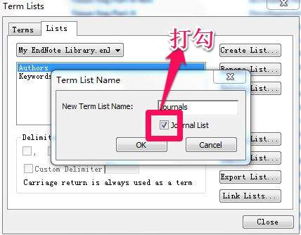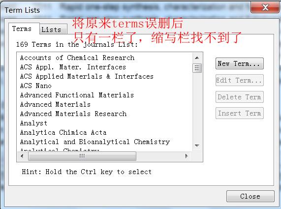 经过多次摸索,已经解决此问题,建议斑竹设为交流贴~~希望帮助到更多人! 解决方法:点击Tools——Open term lists——Journals term list——点击list选项卡,选中Journals——点击 delete list——再点击creat list 命名为journals——再点击import list——导入小木虫上很多整理好的list就好了! 附图片 http://good.gd/2244170.htm |