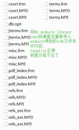 主要问题就是在导入endnote journal list时,将原来的termlist数据删除错了,原来termlist 期刊缩写一栏没有了,不知道如何恢复。。。。。。 这个问题以前有虫友问过,但是遗憾的是那上面的方法对于分组较多的情况不适用啊,工作量太大,而且copy后的效果应该不会和以前一样。。。 原帖地址:http://muchong.com/bbs/viewthread.php?tid=3880331&page=1#pid8 我按照原帖六楼方法:chengtaowang 新虫 (初入文坛) 也有这个问题, 主要是XXX.Data中的rdp文件夹出现问题. 我的操作如下: 1. 把出问题的XXX library 拷贝到别处(比方说桌面), 2. 从桌面上打开library. 注意, 这时你的桌面上会出现一个和library相同名字.Data的文件夹. 这时请看一下这个新的library中的term list是否恢复. 应该是恢复了. 3. 从桌面出现的的.Data的文件夹中把rdp文件拷贝到你原先出问题的那个XXX. Data中,覆盖原来的rdp文件夹. 按照这个方法,重新导入大endnote后确实term list 恢复了,但是原来好多分组都没有了,而rdb文件夹中内容我也不清楚哪个是管理分组的哦???求牛人帮忙解决一下,多谢多谢! 现在把问题情况重新上传图片,谢谢大家啦! 正常_副本.jpg 不正常_副本.jpg rdb-现在不正常.jpg new rdb_正常无分组.jpg [ Last edited by yaxinda on 2012-10-5 at 16:43 ] |