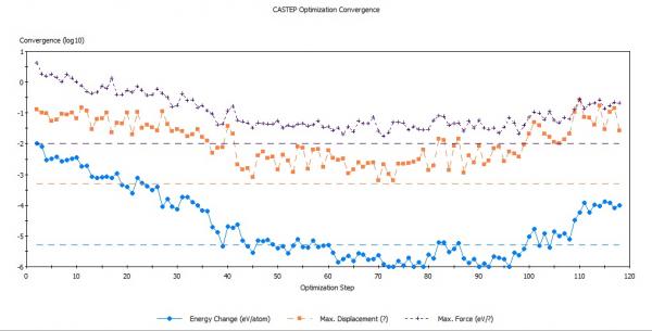 最近 计算一些复合物的性质 没想到卡在几何优化的那步 因为有以下图为证: 能量、位移、应力的变化先下降 后上升 这个在16核的服务器上计算了16天 是否意味着不能收敛 如果迭代次数达到设定值300 还没有成功收敛应该如何调节参数 ???????????? 拜求高人指点!!!!!!! 无标题.jpg |