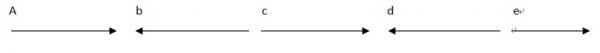 根据你的图,箭头一般标示5’至3‘。所以我认为a,c,e基因在(+)链上,b,d基因在(-)链上。