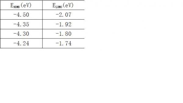 物理学上,电子的真空能级坐标是假设无穷远处为0的,因而,所有的电子能级都是负数,越负,就是远离O点,负数越小(绝对值越小),能级就越高。因此,你表中的HOMO and LUMO数据都是从上至下依次升高的。