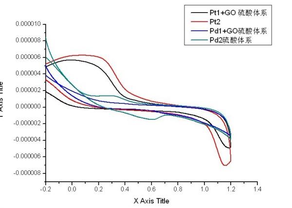 另外,之前简单的做过加GO负载、啥都不加的的CV曲线,反而倒是有峰出现,不过这个峰和文献上的也是有区别,不知道问题出在哪里,求解答(下图中Pt2后面漏写了+H2SO4):